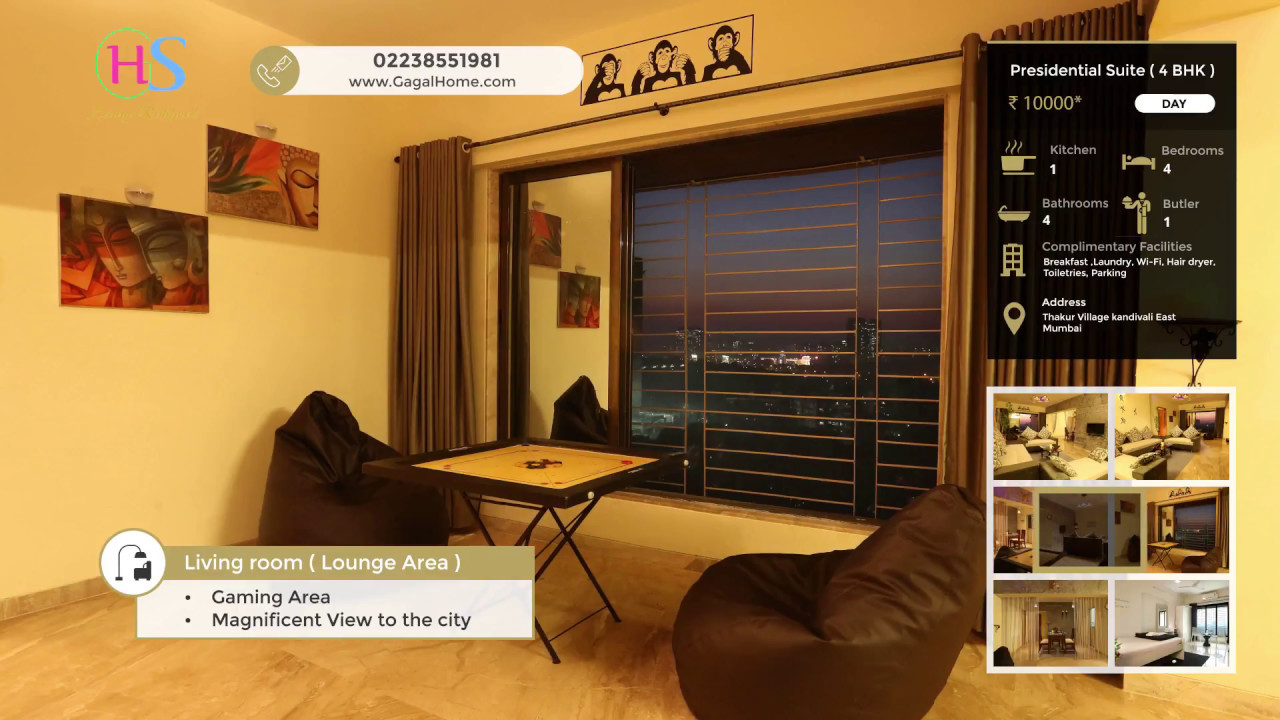 4BHK Presidential Suite at Kandivali East is the perfect place to stay for large number of members. This 4 bedroom apartment is highly assistive in permanent residency or vacations for large group of friends and large families as it has a maximum occupancy of 12.